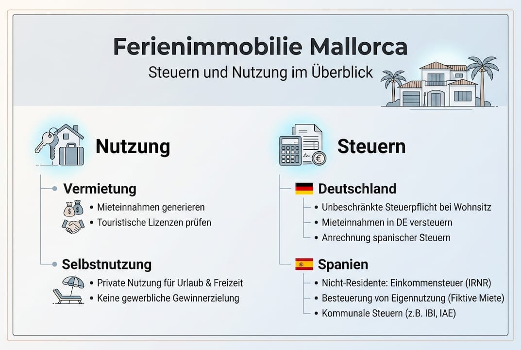 Als deutscher Staatsbürger mit einer Ferienimmobilie auf Mallorca haben Sie Steuerpflichten in zwei Ländern. Das ist keine Doppelbelastung im Sinne einer doppelten Zahlung, aber es bedeutet doppelten Verwaltungsaufwand und zwei verschiedene Rechtssysteme.