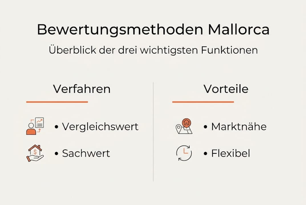 Die drei Hauptmethoden der Bewertung sind das Vergleichswertverfahren, das Sachwertverfahren und das Ertragswertverfahren. Auf Mallorca wird je nach Immobilientyp das passende Verfahren oder eine Kombination eingesetzt.