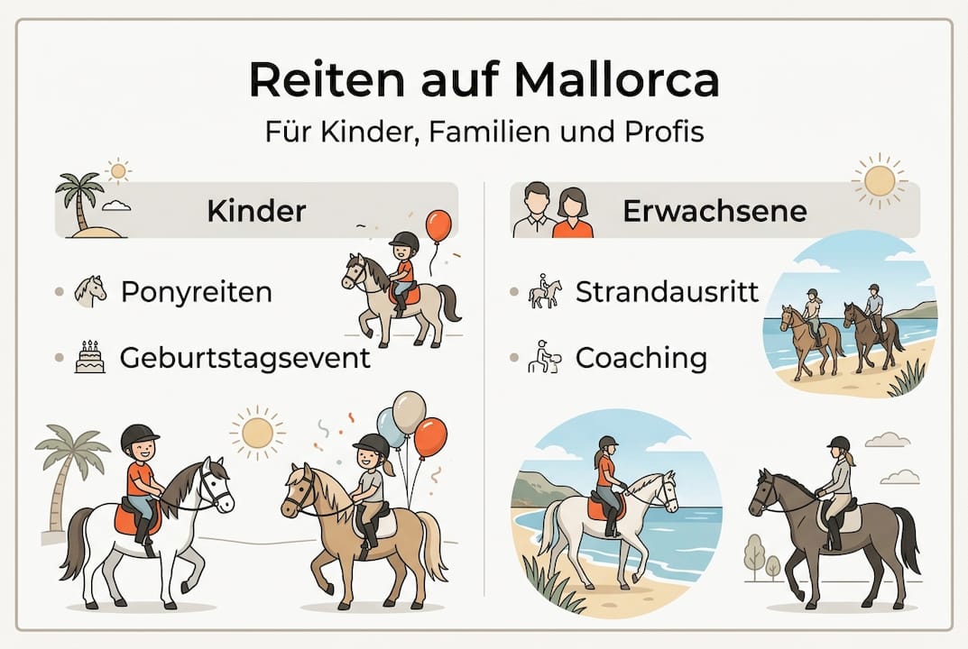 Mallorca ist eine echte Pferdeinsel. Das Angebot reicht von einfachen Schnupperstunden für absolute Anfänger bis hin zu mehrtägigen Profi-Camps für ambitionierte Sportler. Die Vielfalt der Landschaften, das angenehme Klima und die hohe Qualität der Anlagen machen die Insel zu einem der attraktivsten Reiseziele für Pferdeliebhaber in Europa.